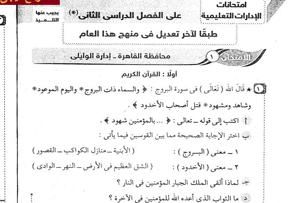 امتحان الدين للصف الرابع الابتدائى ترم ثانى 2018 ادارة السادات التعليمية محافظة المنوفية تم امتحانة فعلا