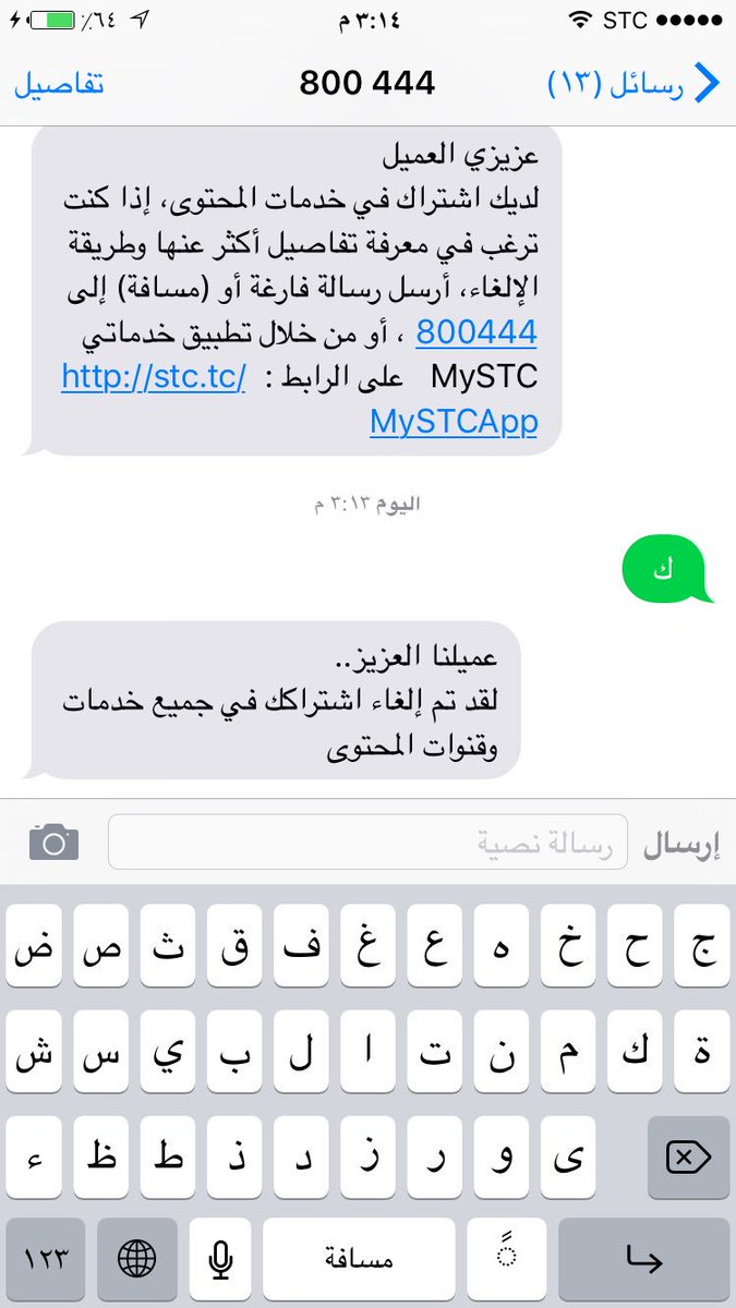 العناية بالعملاء Stc السعودية On Twitter مرحبا بك ارسال برسالة فارغه إلى 800444 وستتبين مدى اشتراكاتك في خدمات المحتوى ارسل حرف ك إلى 800444 لإلغاء خدمات المحتوى شكرا لتواصلك معنا Https T Co B8rnifruel