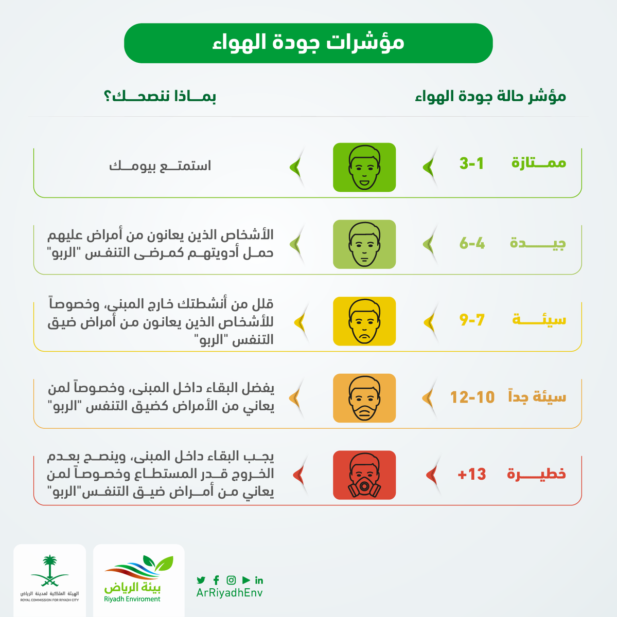 بيئة الرياض On Twitter طو رت الهيئة الملكية لمدينة الرياض مؤشرات جودة الهواء التي تشرح حالة ملوثات الهواء بأنواعها وخطورتها لتزو د السكان ببيانات حالة جودة الهواء في المدينة بيئة الرياض Https T Co Xpfeeqxp7e