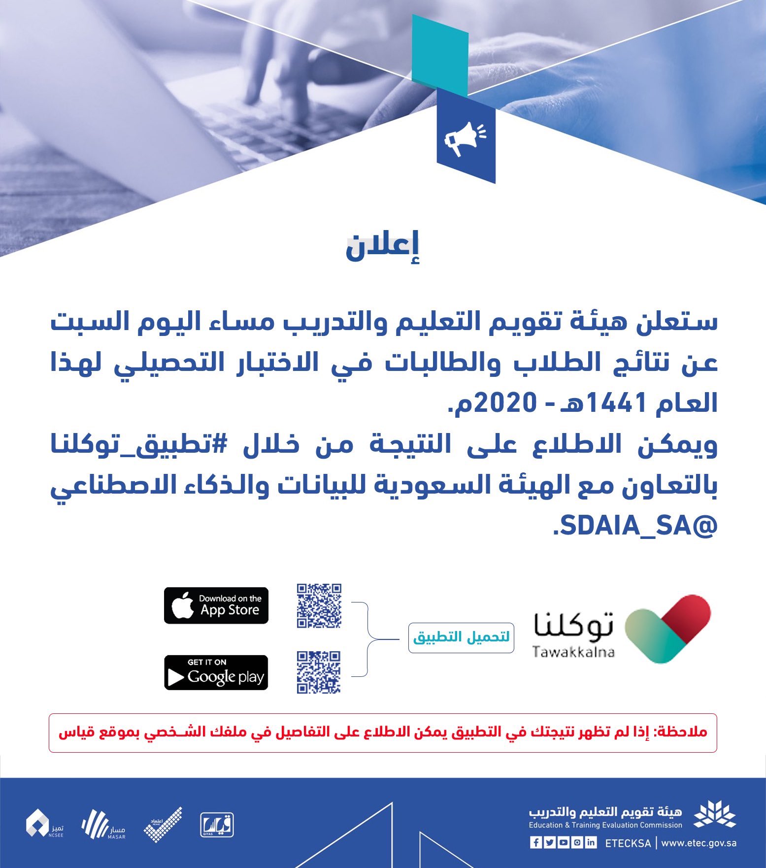 O Xrhsths تقويم السعودية Sto Twitter ستعلن هيئة تقويم التعليم مساء اليوم عن نتائج الاختبار التحصيلي ويمكن الاطلاع على النتيجة من خلال تطبيق توكلنا بالتعاون مع الهيئة السعودية للبيانات والذكاء الاصطناعي Sdaia Sa لتحميل