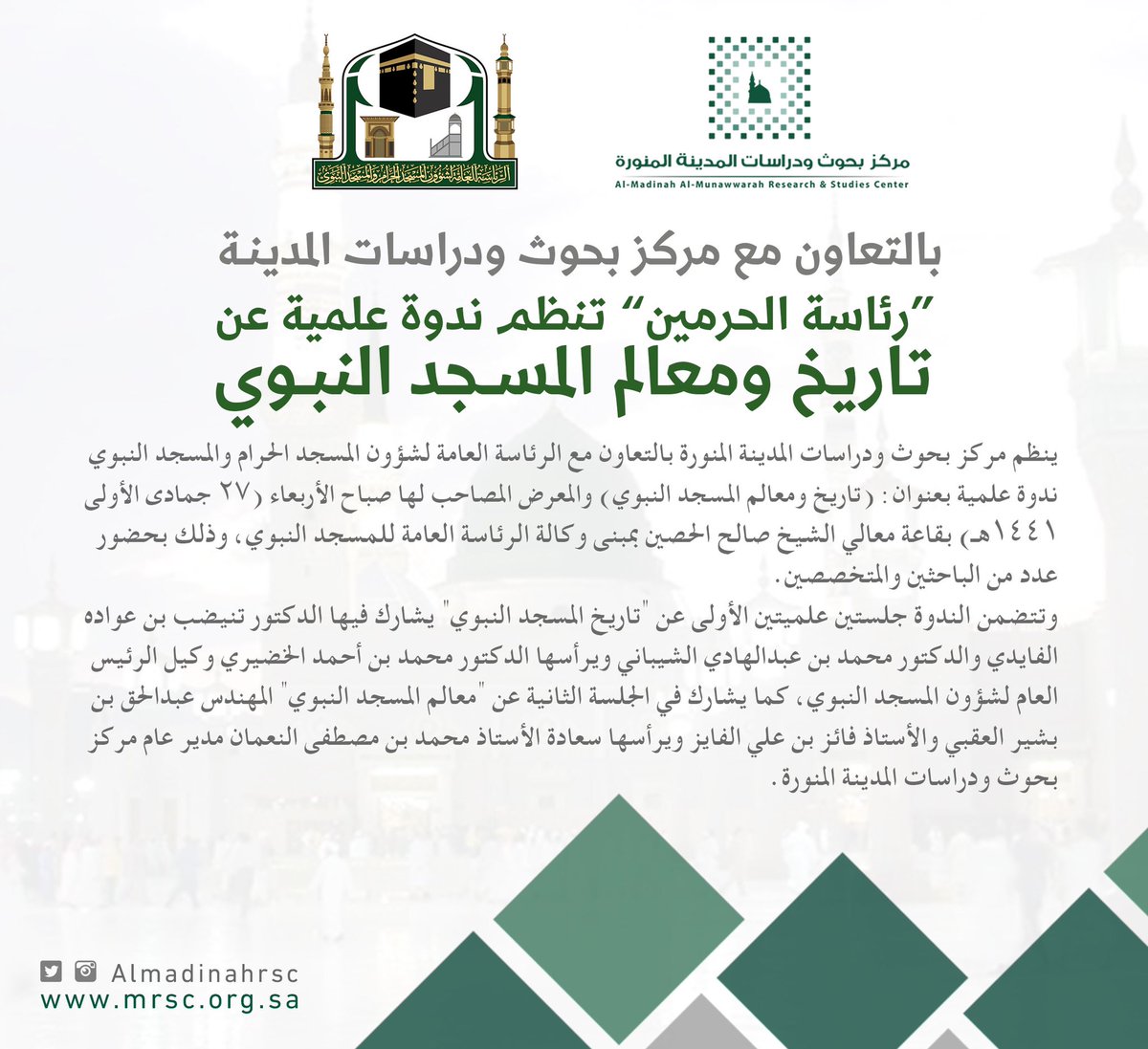 مركز بحوث ودراسات المدينة المنورة On Twitter ندوة علمية تناقش في جلستين علميتين تاريخ ومعالم المسجد النبوي غدا مركز بحوث المدينة